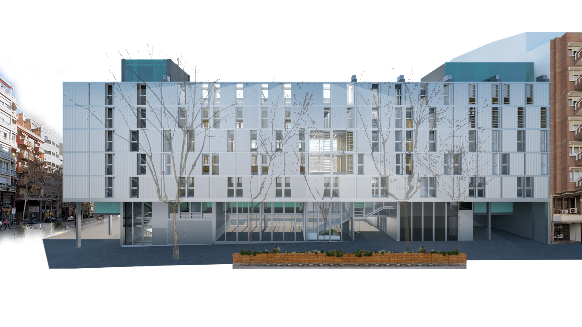 We believe it is important, after 18 years, that the image of the complex be maintained, even that it recover some idea of the original draft where we proposed double-height perforations so that the Sun passes through the building-screen to C / Londres through holes in façade, green leisure spaces, taking as a reference the project for the Savings Bank on Tusset street by JL Sert from 1976.