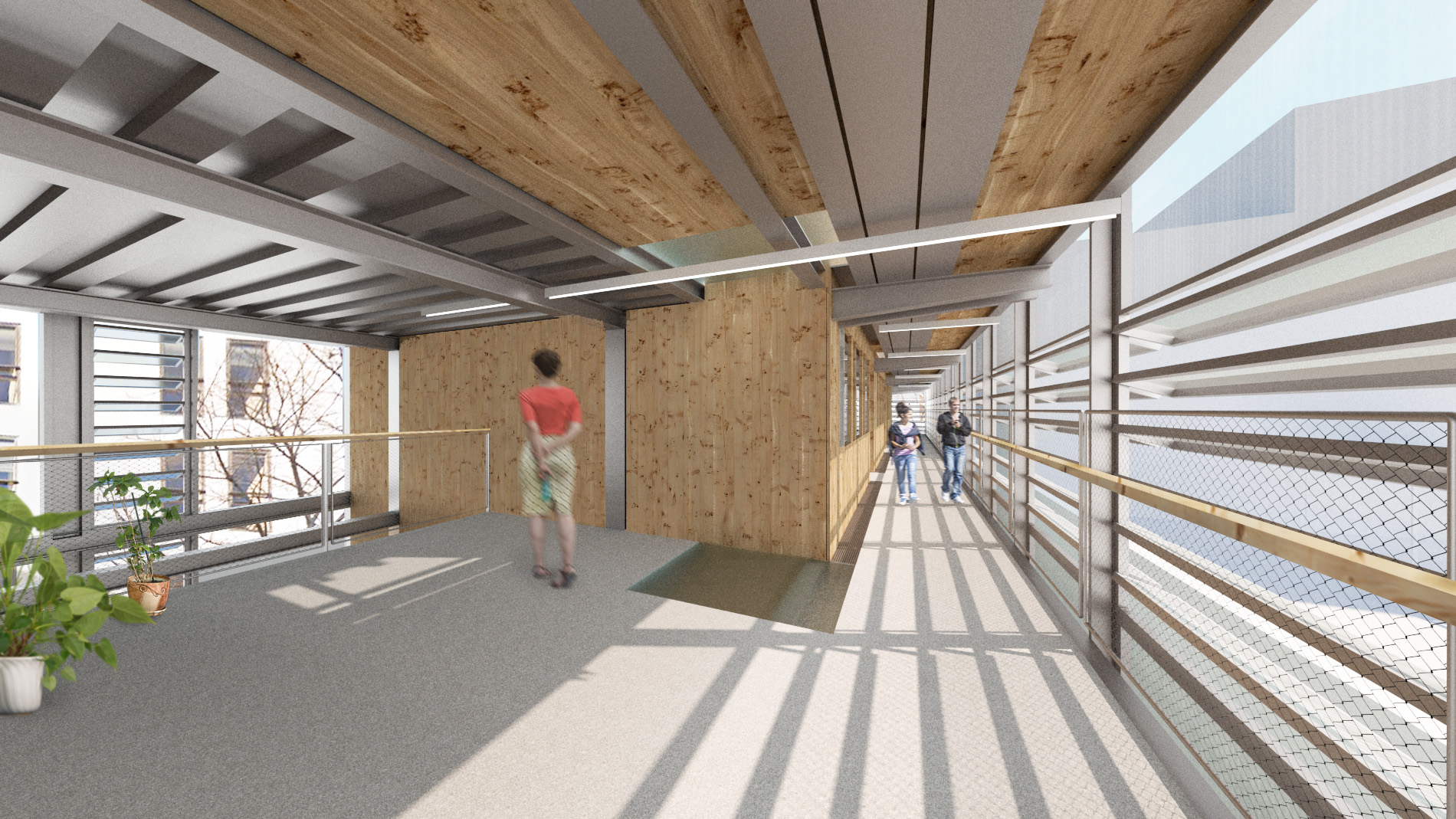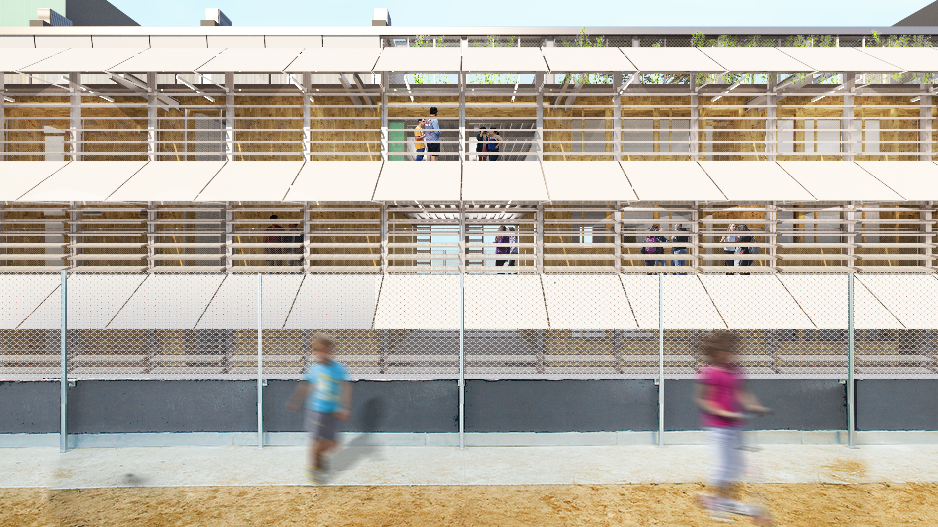 We maintain the transparency of the south façade, open to the tranquility and good orientation of the block patio, but enriching the plan, originally too simple and with little constructive quality, to transform it into a deeper façade, where some wooden boxes add to the space of the classrooms to complete its surface area (the houses are 42 m2 and one classroom is 52.5 m2) and have exterior and interior vestibules, avoiding direct access and exit to the children’s corridor.