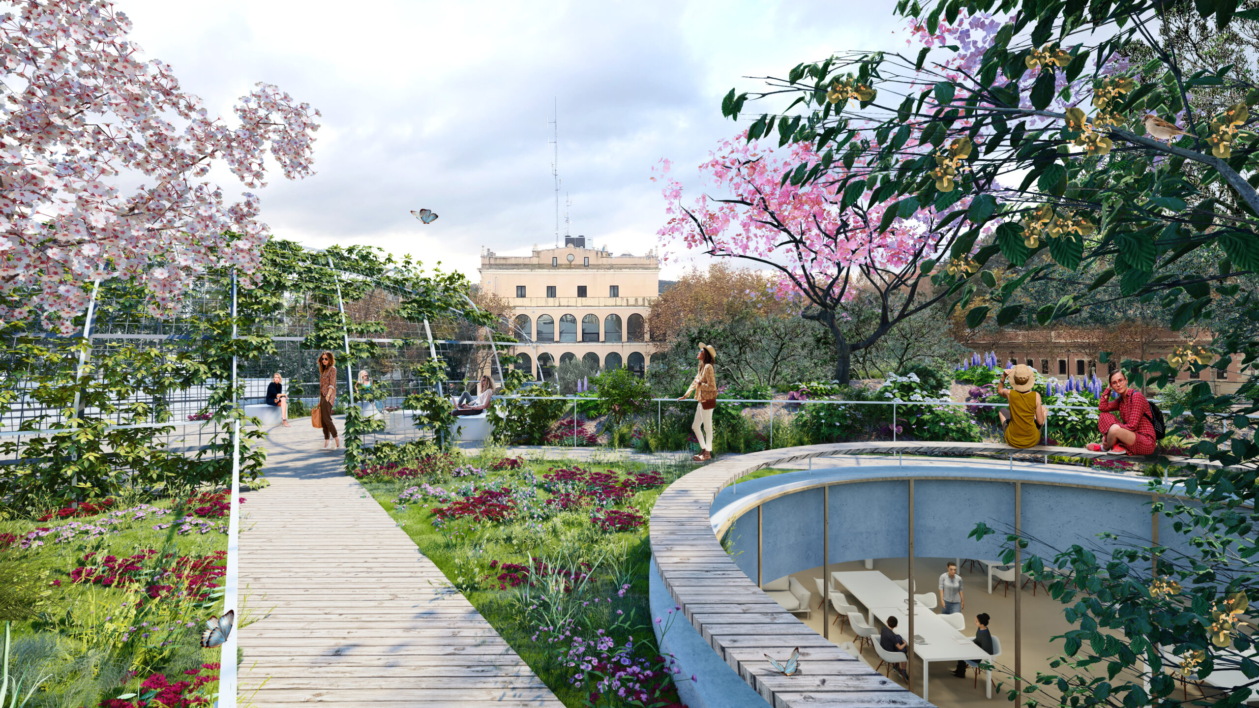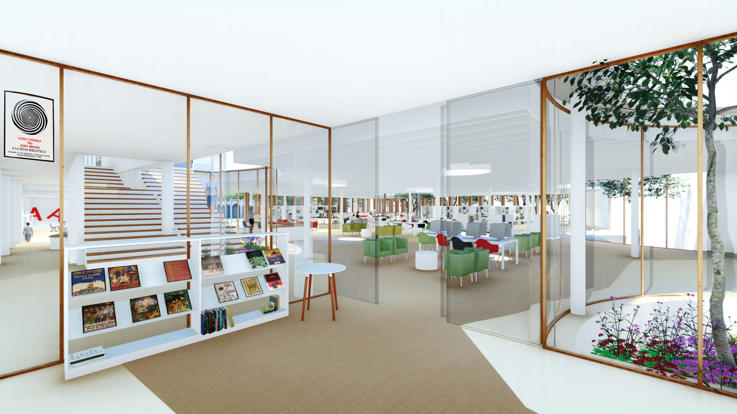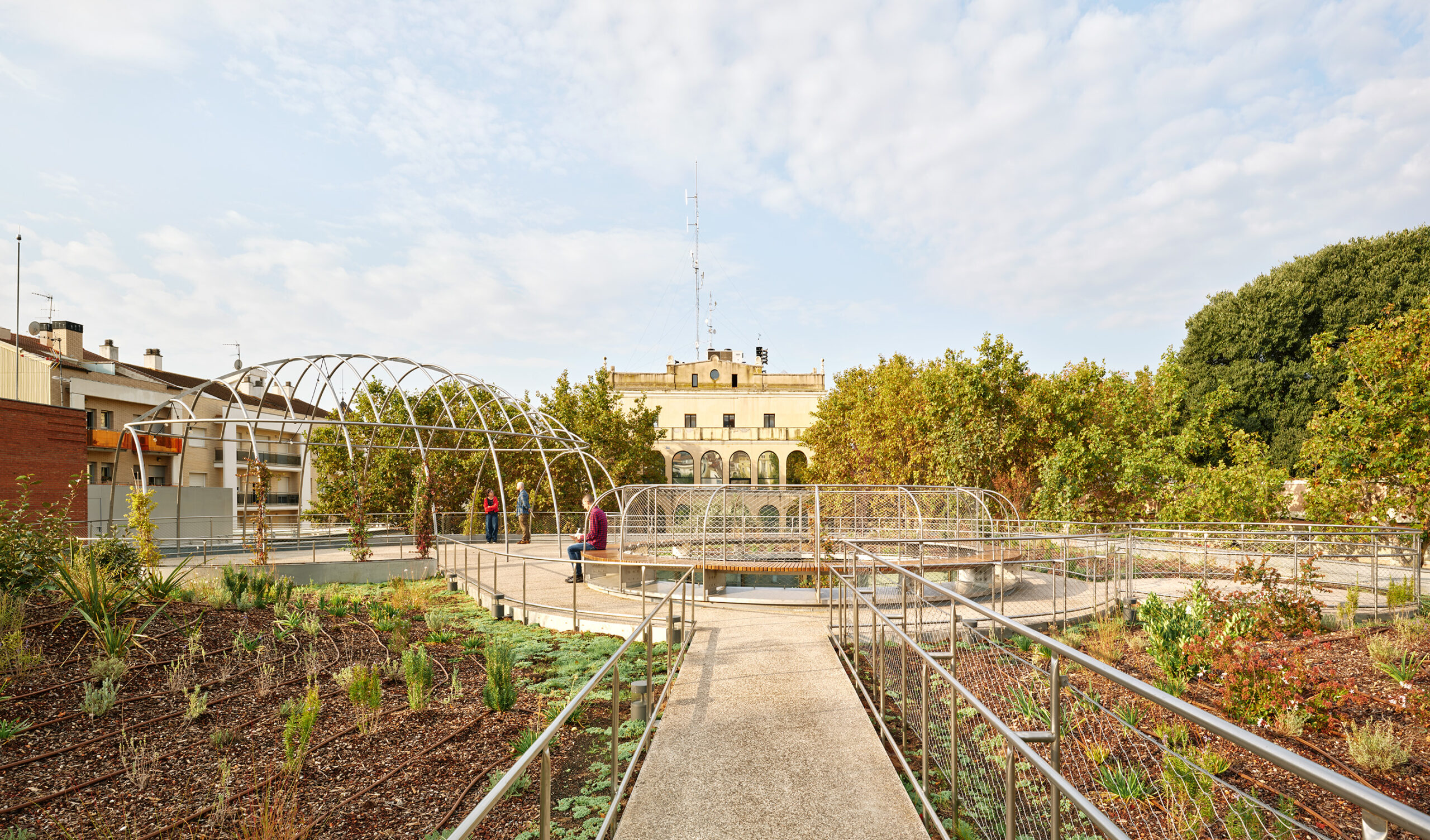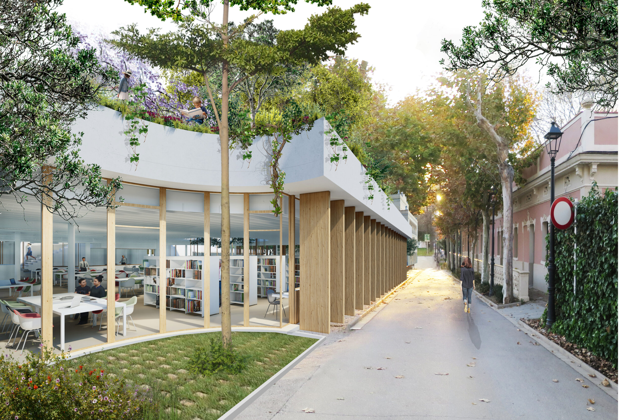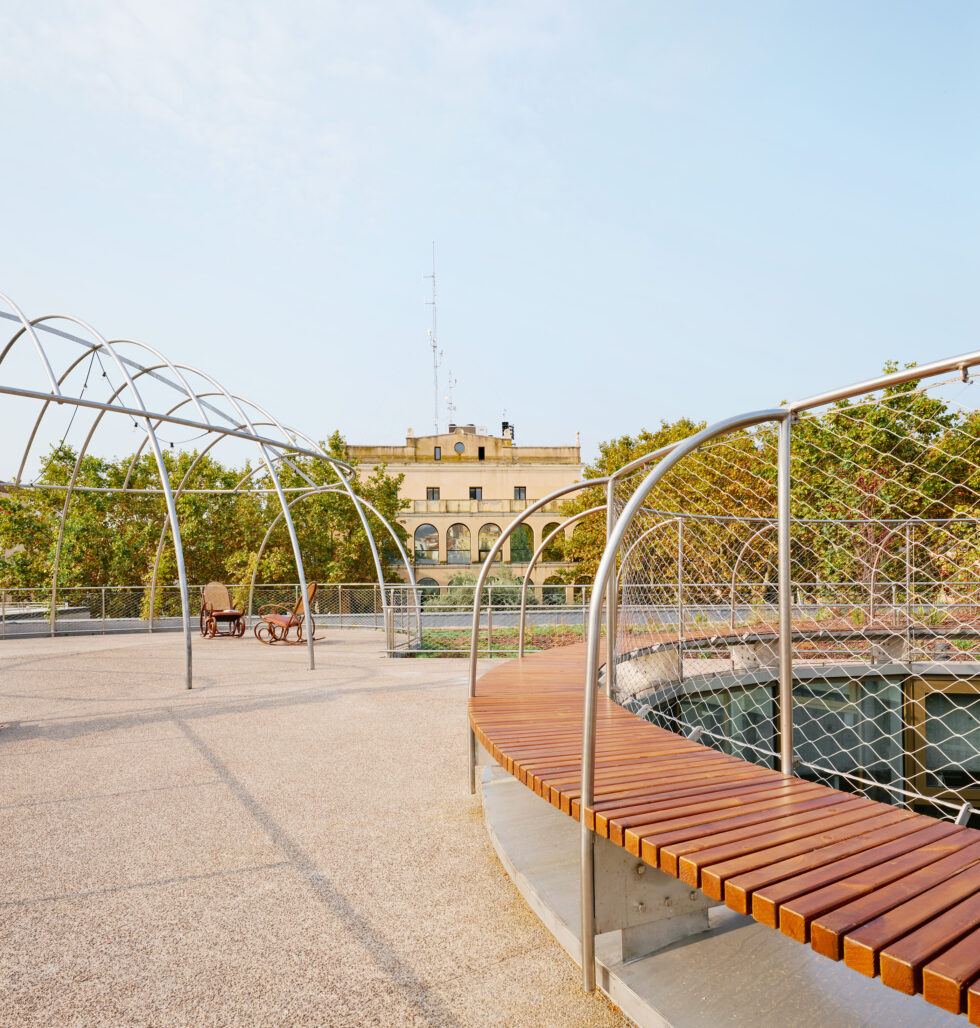 - WE ARE EXPANDING ON ONE FLOOR: AN ECOLOGICAL DECK OF 1007 M2. A thick ecological cover of 1007 m2 covers the entire available lot. We do not leave waste, spaces for “urbanization” but we add green space where there is now a parking lot. This green cover is an outdoor reading space controlled by Bibliolilà.