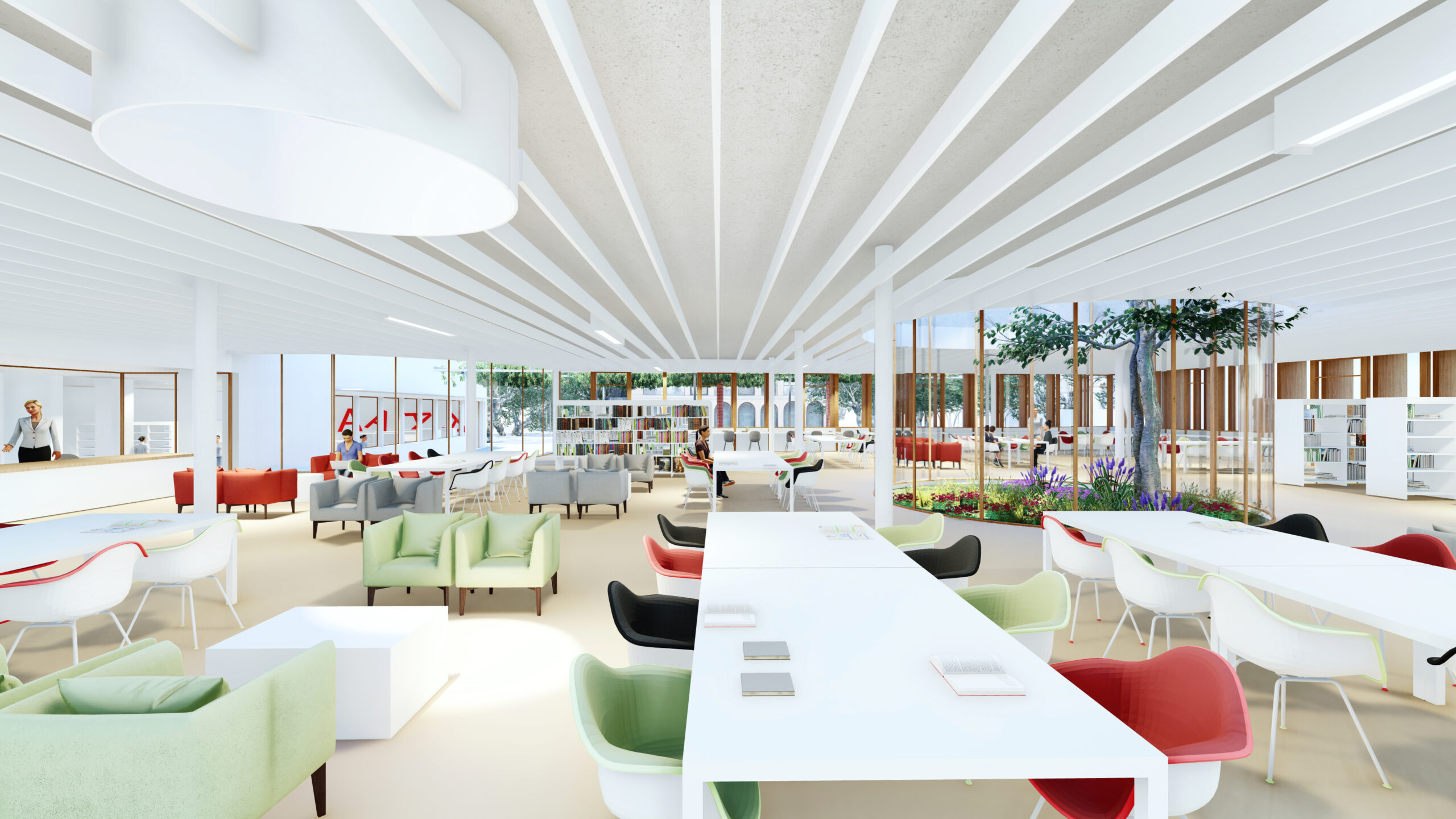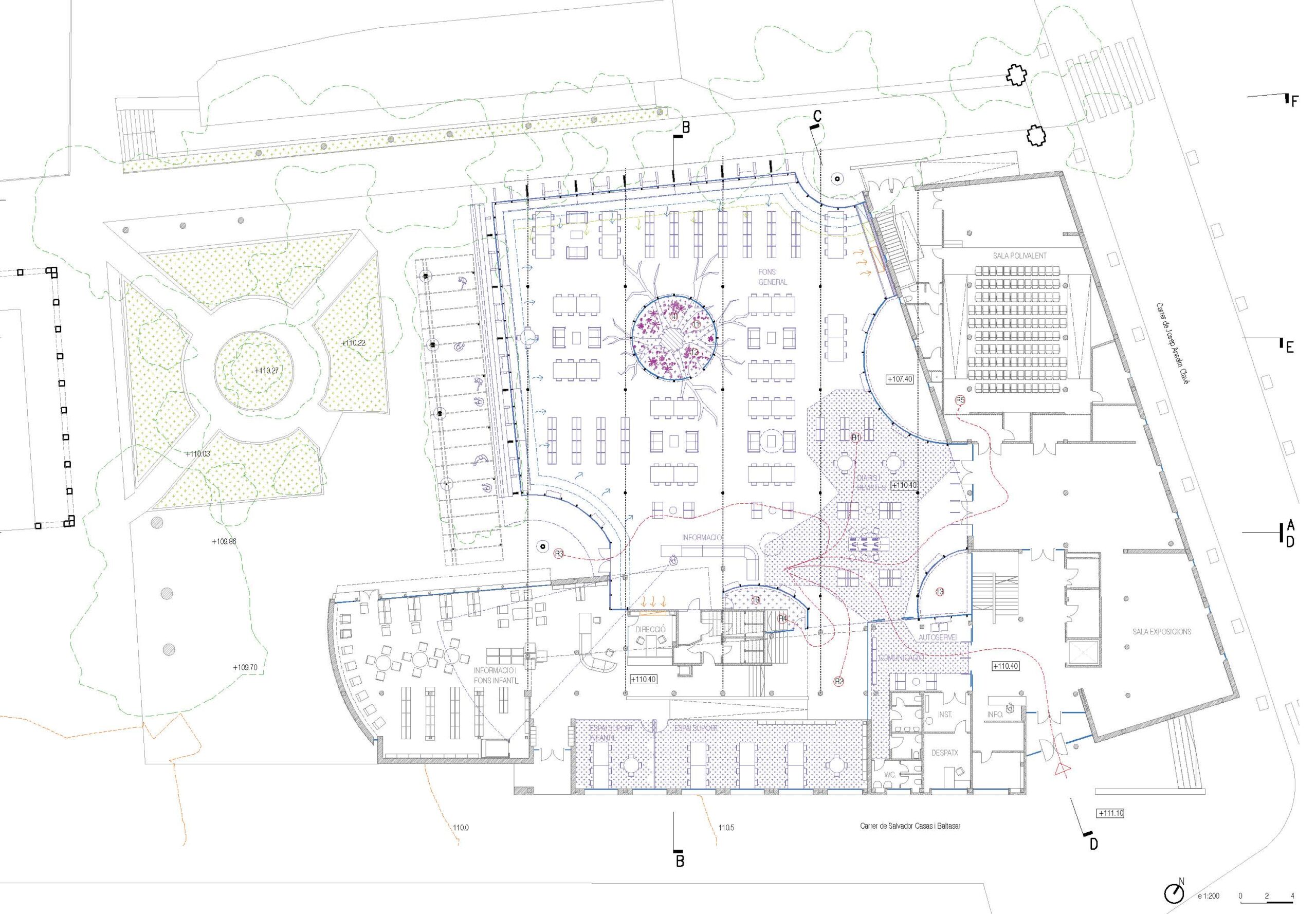 - THE GENERAL AREA IS IN ITSELF A LANDSCAPE. The ecological cover covers the new general area, located all on the same level, with a single central control that also has visual control with the old library (new children’s area) and with a direct visual relationship with the outside garden. A plot of round pillars and three patios generate an interior reading landscape where natural light is introduced up to the basement, ventilation and freshness in summer and comfort for reading.